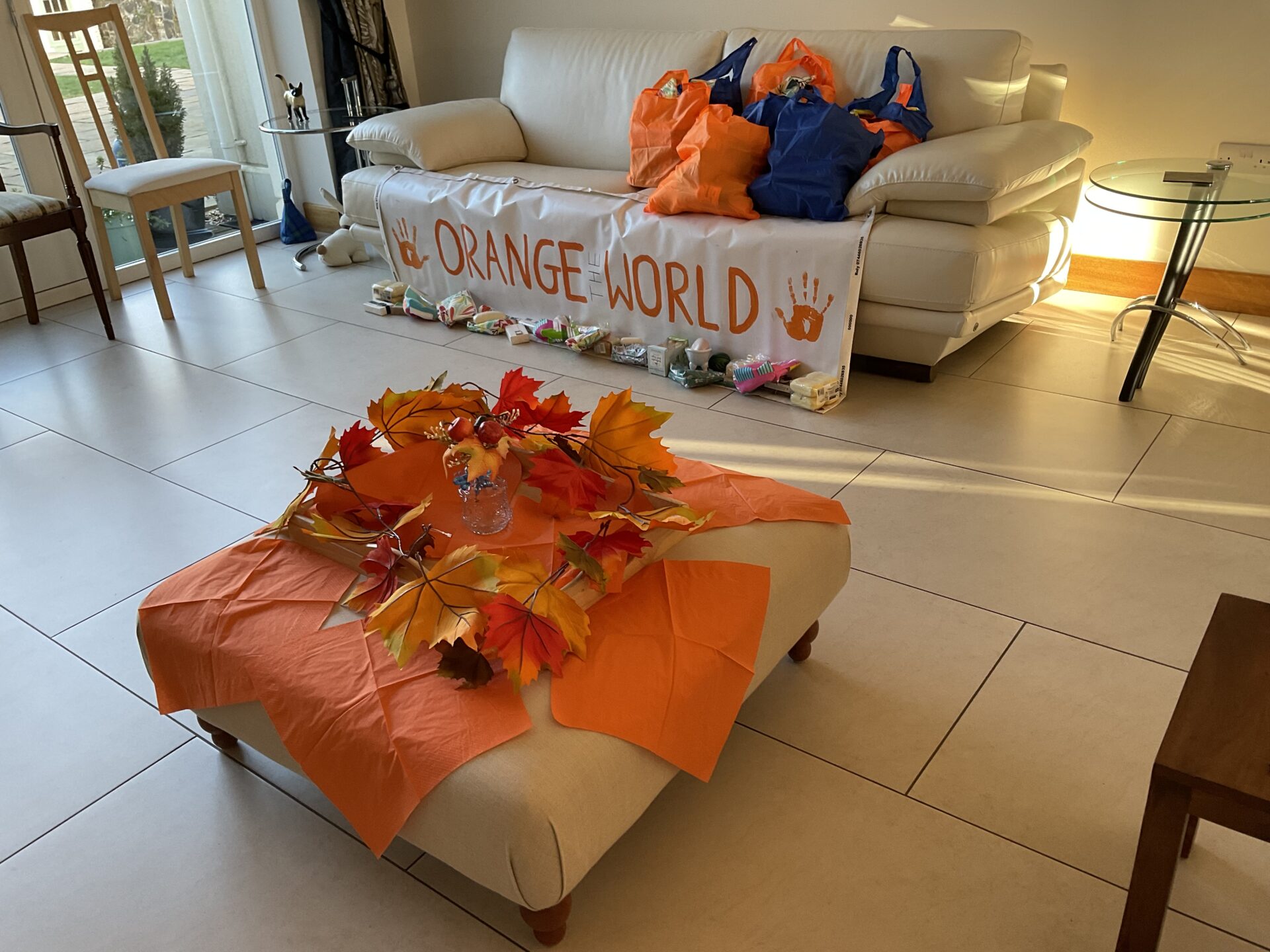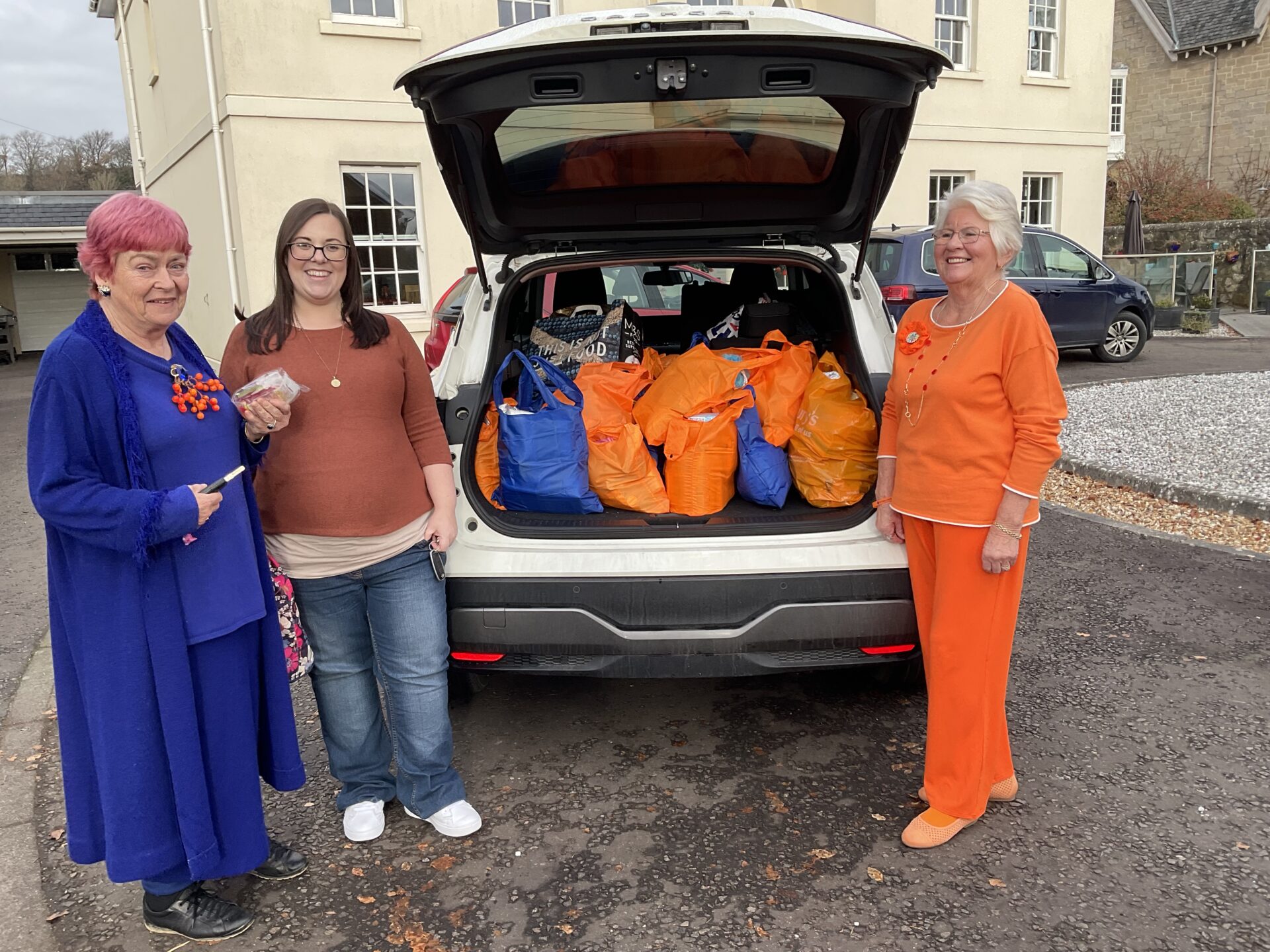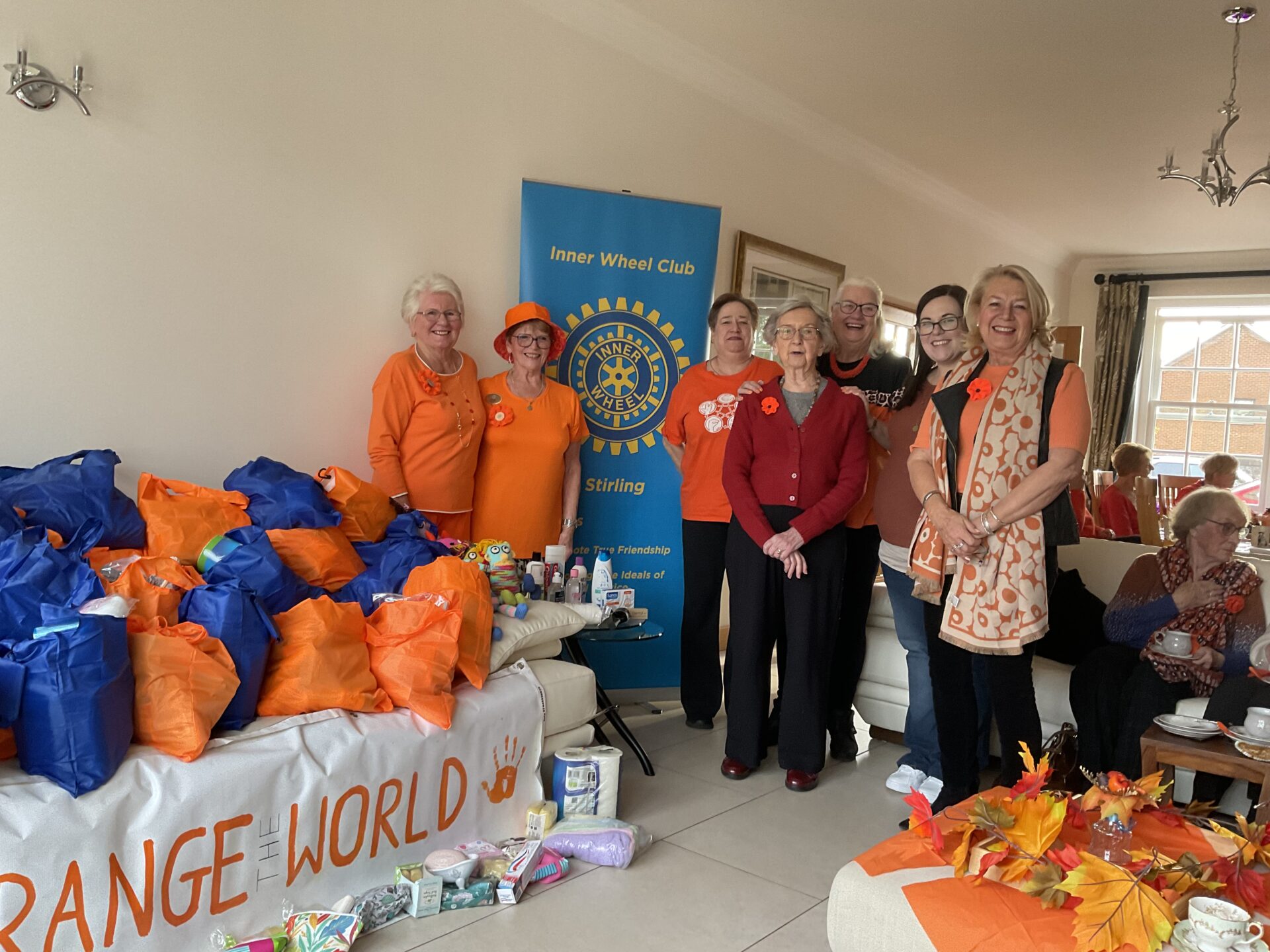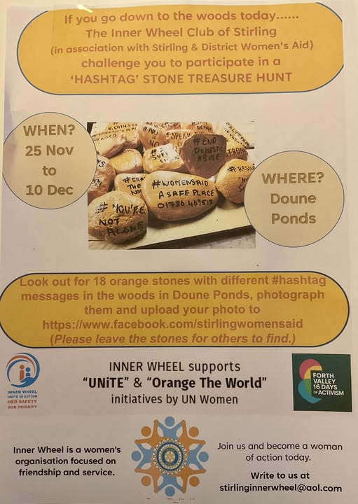 Nanette Thomson (1st Vice Chairman) hosted an Orange the World coffee morning at her house to start off the campaign to end violence against women and girls. Here are a few photos of the coffee morning and donations collected for Women’s Aid. A representative of Women’s Aid collected all the bags to distribute to women. The flyer below highlights the Stirling Club’s orange stones scattered around Doune Ponds. Each stone has a message.