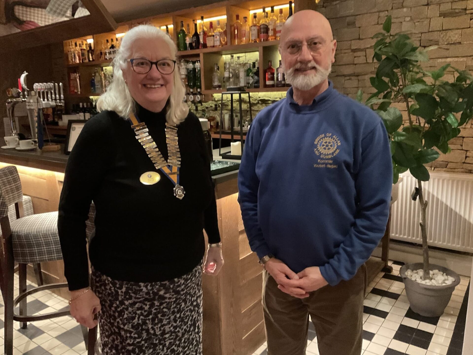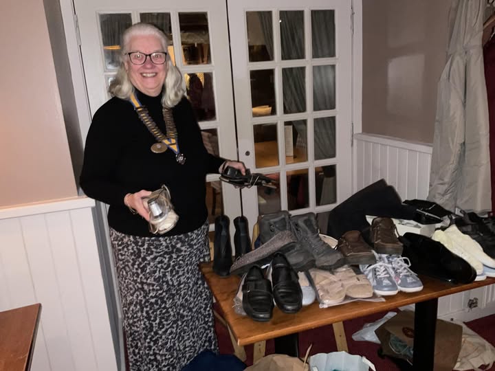 At their January meeting  the members brought in an amazing quantity of shoes, boots, trainers etc which are to be donated to the local Chest, Heart and Stroke Charity shop. This is their act of service for Inner Wheel Day . Well done ladies for taking a ‘Step up and leading by Example’. President Jen with a small sample of the items donated.   Jen is also pictured with their speaker who comes from Iran but who is also a member of Bridge of Allan Rotary Club.