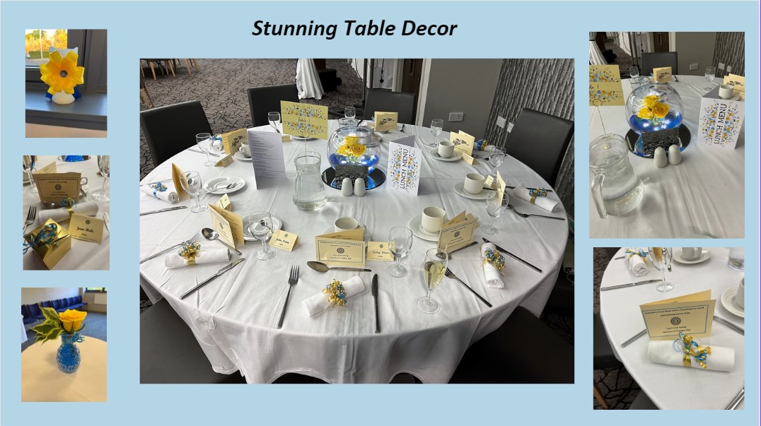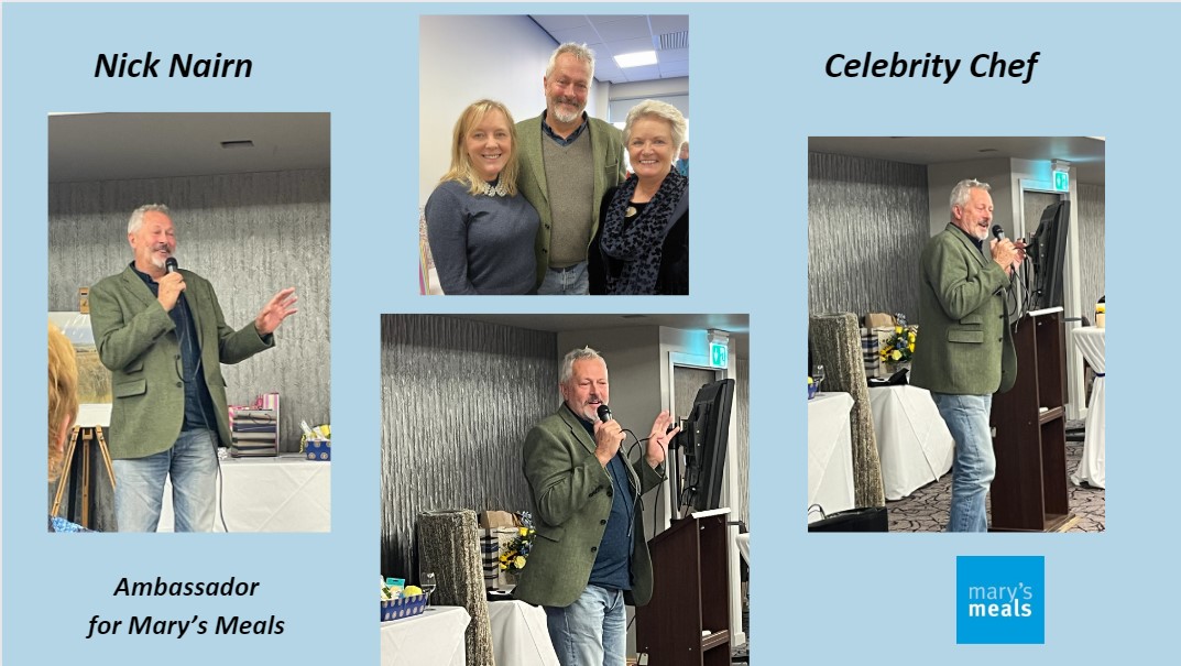 A fabulous time was had by all at the International Rally hosted by District International Service Chairman, Nanette and the Stirling Club.   Well done Stirling – a fabulous result of £1670 raised for Mary’s Meals. PPhotos show Nick Nairn (main speaker), Sally Davidson (speaker for Mary’s Meals) and Nanette receiving her flowers from President Teresa Hill as well as many others of the day.